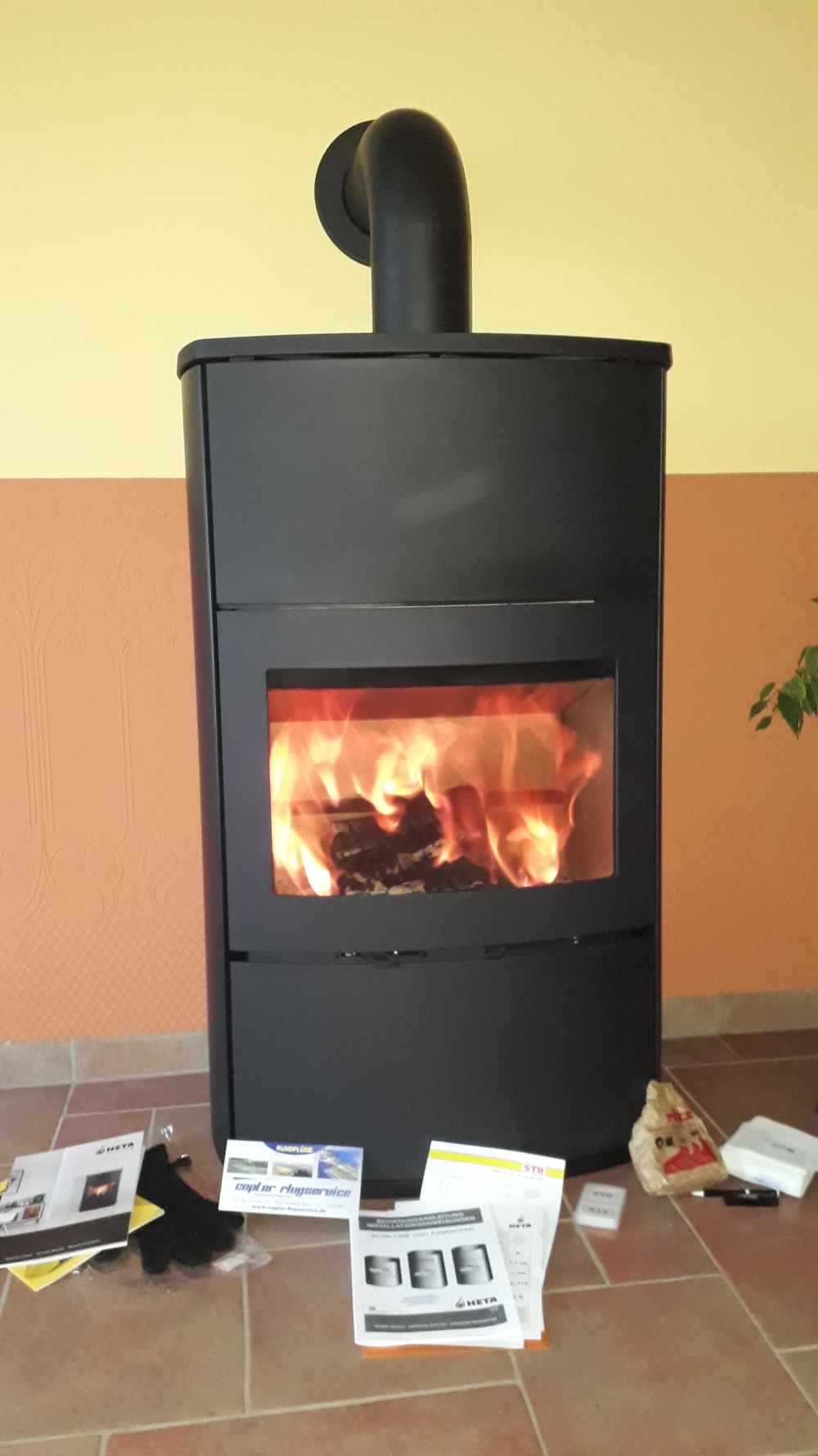 Kaminofen 5,5 EN KW,mit hochwirksame Scheiben-Luftspühlung. Natursteinbekleidung komplett in Tobacco und hoher Aschetür.